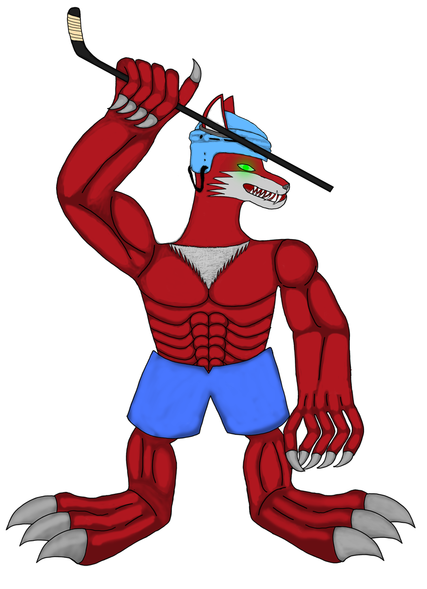 This was my entry for FAU7's Kaiju Art Contest. A red wolf, once a hockey player who saw nothing wrong with slashing an opponent in the face or punching a referee in the groin. Yes, he was the dirtiest canine on the ice, until one evening when someone from another team’s fan base put something a bit nuclear in his water bottle in the hopes it would eliminate him. Instead he was transformed into a 1000 foot tall monster. He now stomps around from city to city, feasting on any athletes he can find (with a strong preference for hockey players) and crushing everyone else under his sweaty feet. He loves nothing more than to see his victims choke on his strong musk before finishing them off. He has even been seen stuffing people down his pants and into his jockstrap.