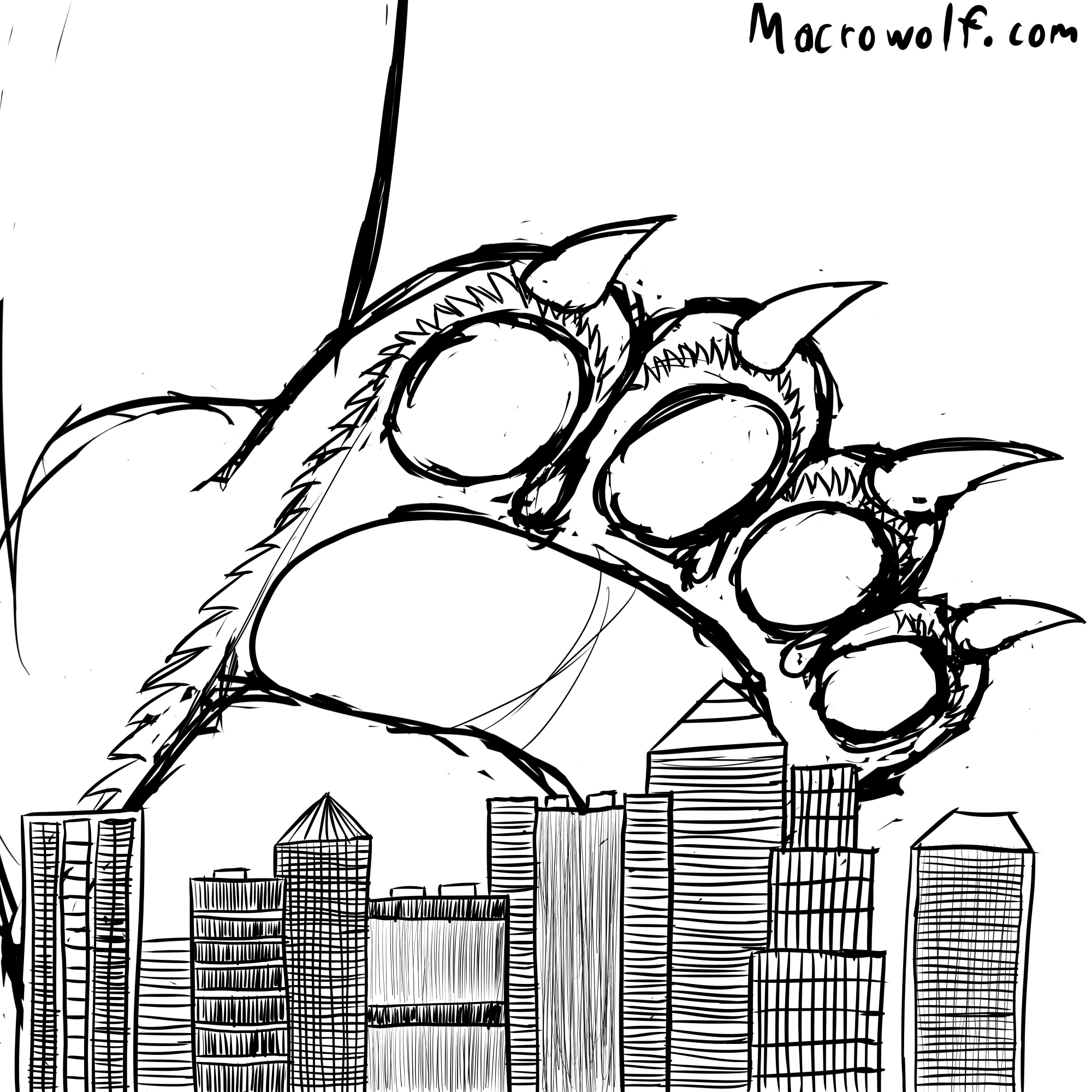 So I've been drawing for inktober, somewhat irregularly, but I have a few to share. Here's the first one. A giant macrowolf paw looming over your city.
